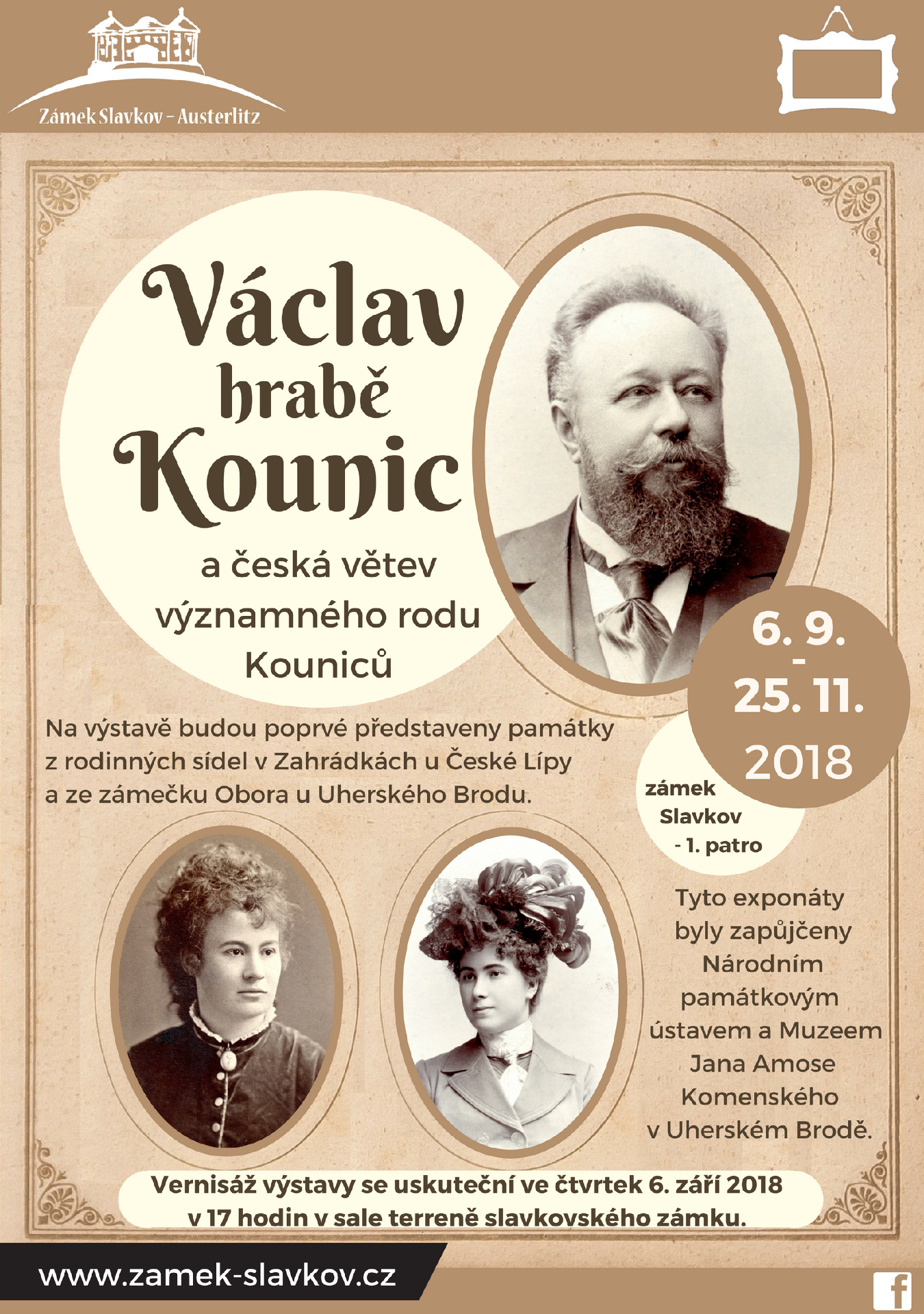 Výstava bude věnována významnému politikovi a mecenáši JUDr. Václavu Kounicovi. (170 let od * a 105 let od†). Osobnost bude představena v kontextu nejbližších představitelů české větve rodu Kouniců, návštěvník se dále dozví, jaký vztah měl Václav Kounic s básníky, malíři či umělci – jako byli např. Josef Václav Sládek, Josef Klír či Antonín Dvořák. Celá výstava bude doplněna předměty z kounicovské pozůstalosti, které jsou uloženy ve sbírkách ZS-A a které byly v posledních 7 letech restaurovány studenty Vyšší odborné školy restaurátorské v Brně v rámci Slavkovského restaurování.