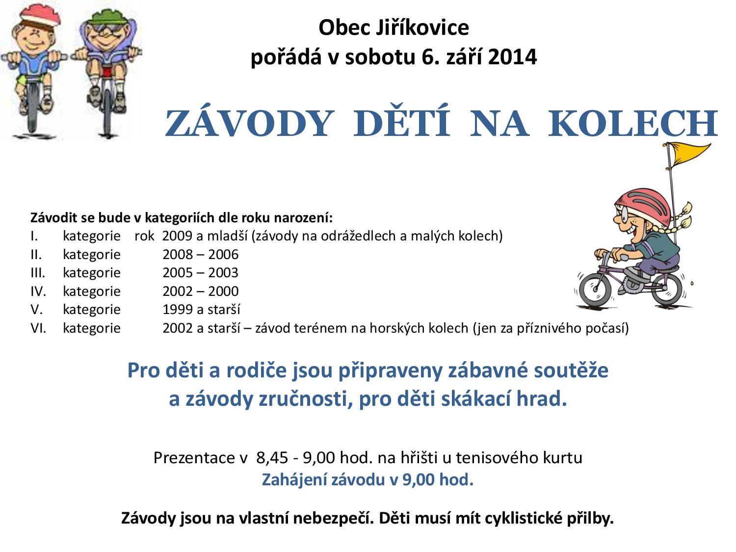 V sobotu 6. září od 9:00 se na horním hřišti v Jiříkovicích uskuteční cyklistický závod dětí. Zazávodit si mohou všechny děti - od těch nejmenších, které pojedou na odrážedlech a malých kolech, až po teenagery, kteří změří své síly v závodu terénem na horských kolech. Soutěžit se bude nejenom v rychlosti, ale připravena je také jízda zručnosti a pro děti, které zrovna nebudou závodit, také skákací hrad.