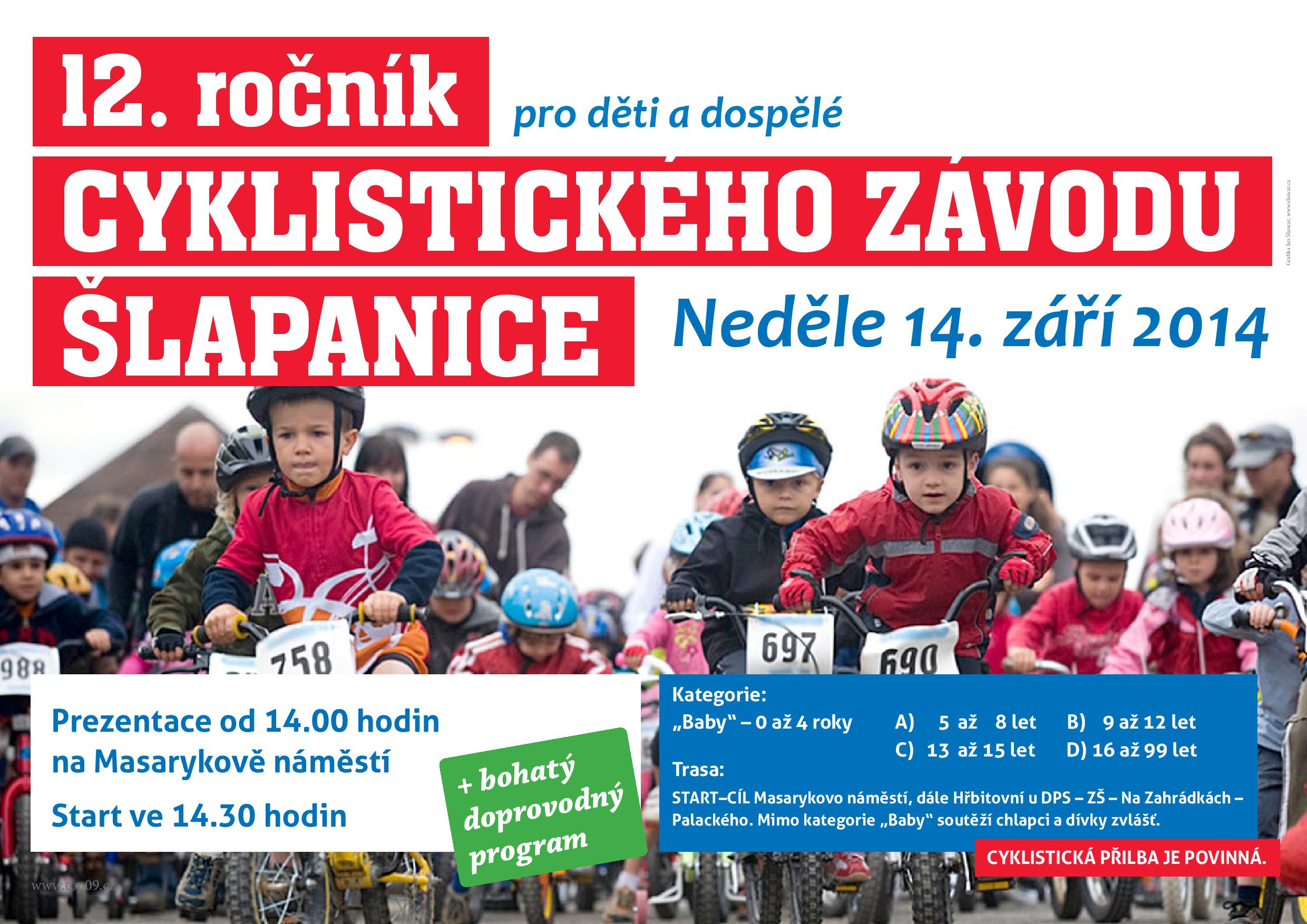 V neděli 14. září od 14:00 se pojede ve Šlapanicích další závod. Tentokrát to ale bude "na vážno". Na Masarykově náměstí bude odstartován 12. ROČNÍK CYKLISTICKÉHO ZÁVODU pro děti i dospělé. Pojede se ve všech věkových kategoriích od 0 až do 99 let.