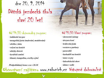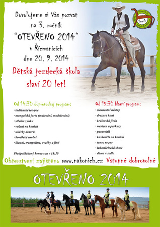 Dětská jezdecká škola v Řícmanicích letos slaví 20 let a v sobotu od 14:30 zve na 3. ročník akce OTEVŘENO. V plánu je různorodý program v indiánském tee-pee či mongolské jurtě, střelba z luku, jízda na koních i ukázka drezury. Více informací k akci najdete na webu www.nakonich.cz
