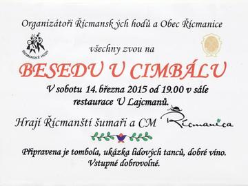 V sobotu 14. 3. se v Řícmanicích koná Beseda u cimbálu, tradiční řícmanická akce. Na posezení se můžete vydat od 19. hodin do sálu restaurace u Lajcmanů.